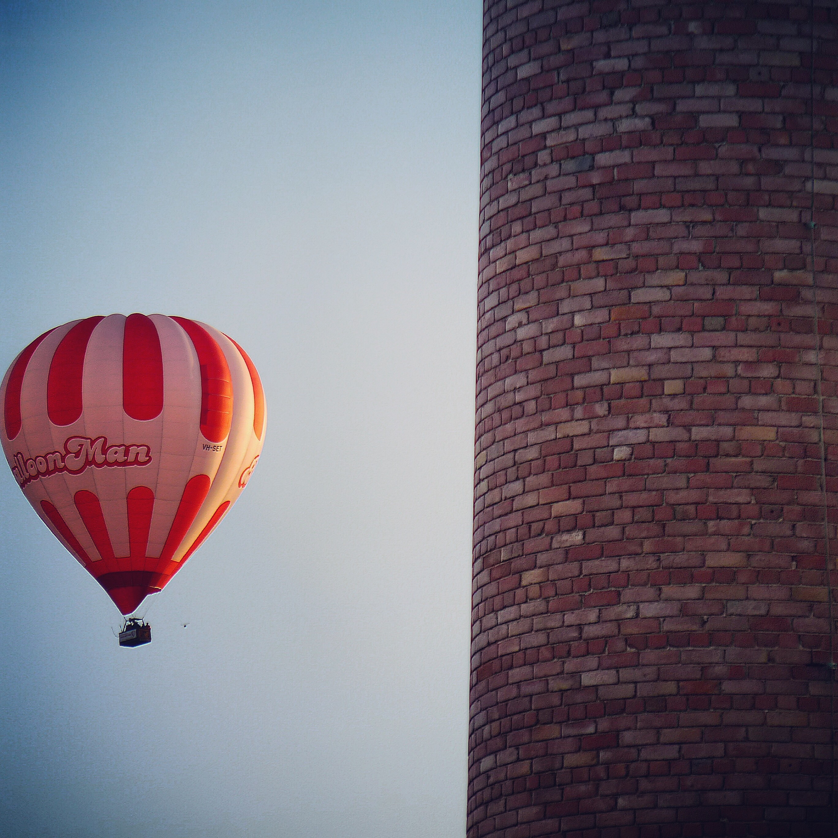 My building was once a hat factory, built in the late 1800’s. When it was turned into apartments a few years ago, the very tall brick chimney that was once part of the factory was left standing. As one of the balloons floated past the chimney I took this shot.