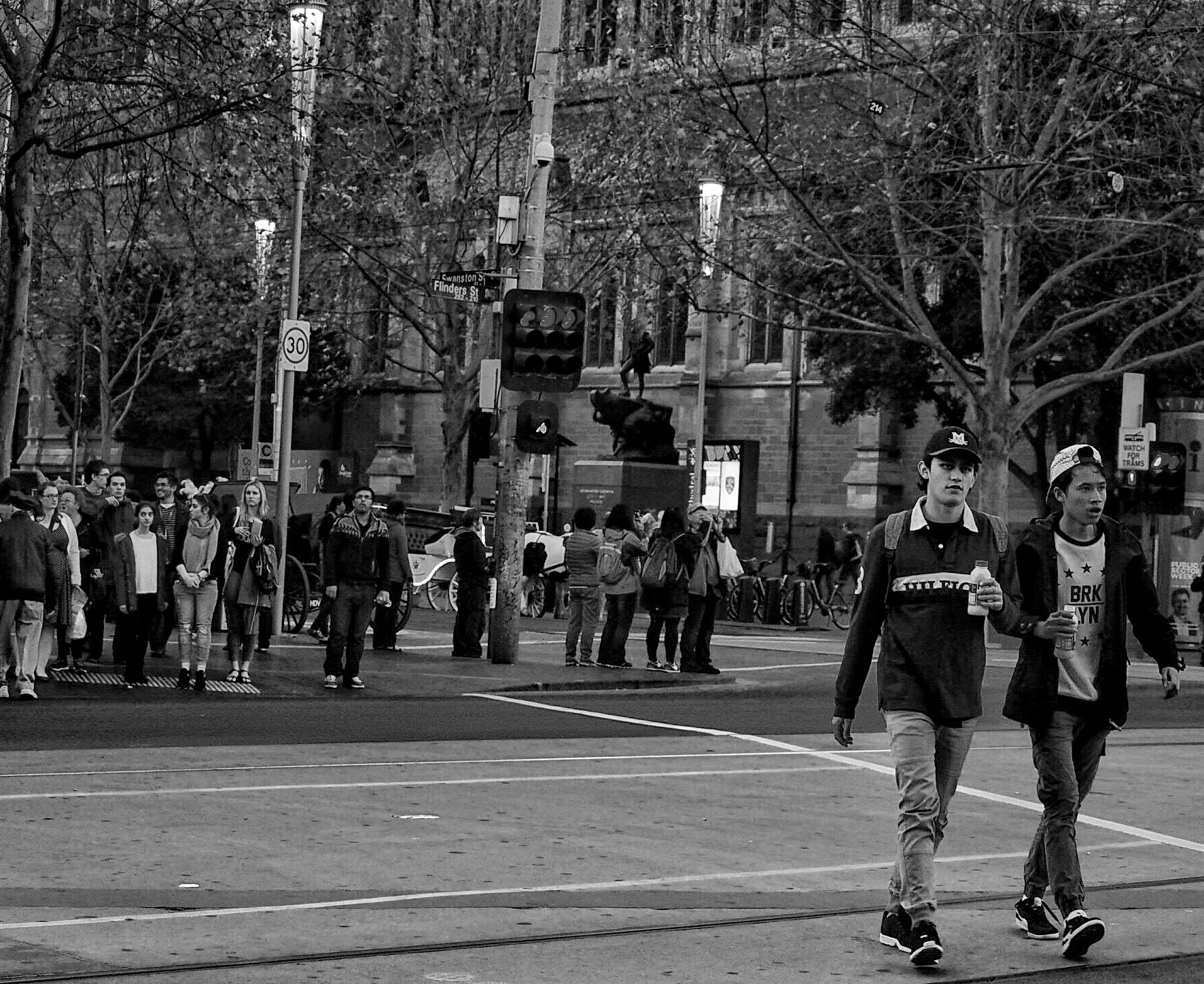Two boys crossing Flinders St